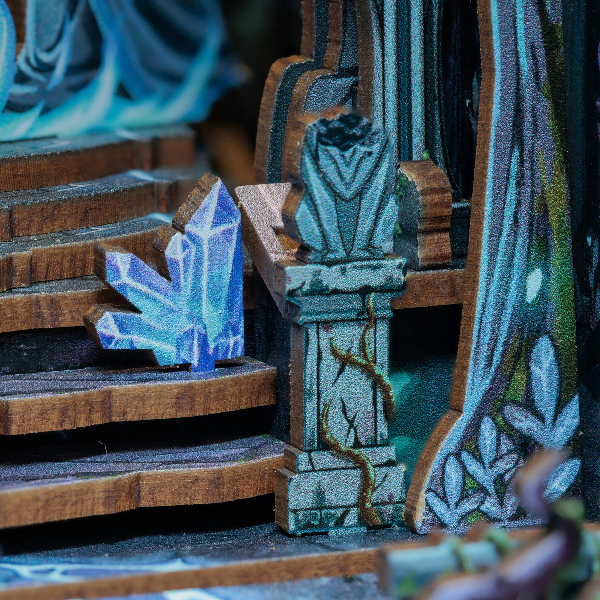 Scattered around the threshold are ethereal blue crystals, humming softly with magic. Grown from the fractures where the worlds nearly bled together, these shards pulse with unstable energy. Old texts warn that stepping too close without protective wards can warp one’s sense of time — or open slivers into realms not meant for mortal eyes.